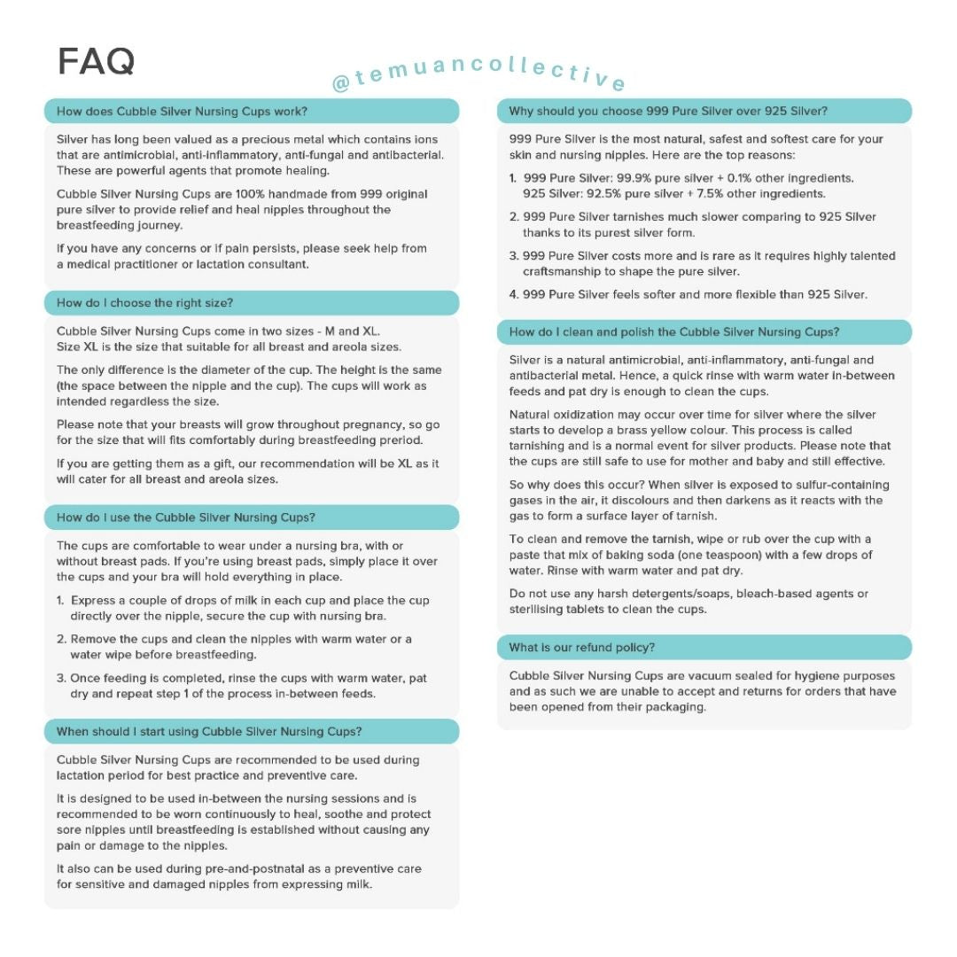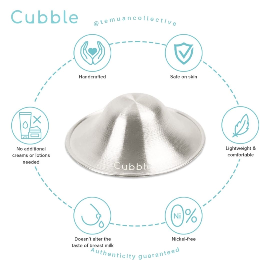 Cubble Silver Nursing Cups are 100% handcrafted from 999 original pure silver to provide relief and heal nipples throughout the breastfeeding journey. 999 Pure Silver is the most natural, safest and softest care for your skin and nursing nipples.
