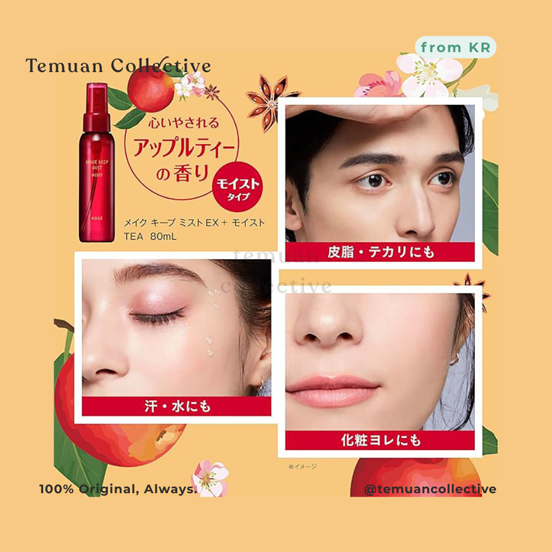 Elevate your beauty routine with the Kose Make Keep Mist EX Moist. This hydrating makeup setting spray locks in your look, delivering a radiant, glossy finish while preventing makeup from smudging or fading. Infused with premium skincare ingredients and a refreshing apple tea scent, it doubles as a makeup enhancer and skincare booster, perfect for all-day wear.